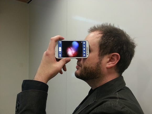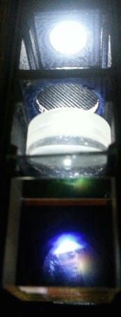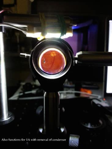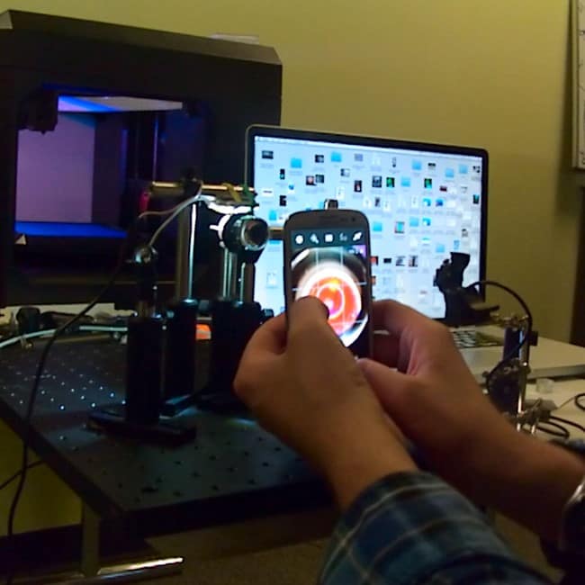 The system comprises of a smart phone (for initial studies a Galaxy S3 was chosen) coupled with a novel programmable waveguide to steer near co-axial illumination through the pupillary plane (Figure 3).  The system is held 25mm from the surface of the cornea co-axial to the foveal center. The wave guide is coupled with the rear facing camera in a small clip-on element. Successive images are captured under varying computationally driven illumination strategies using a user driven visual stimulus control.  A standard 500 mW retinoscope LED is applied in combination with a programmable mask and polarized beam splitter to steer a projected 2mm beam through the pupillary plane.