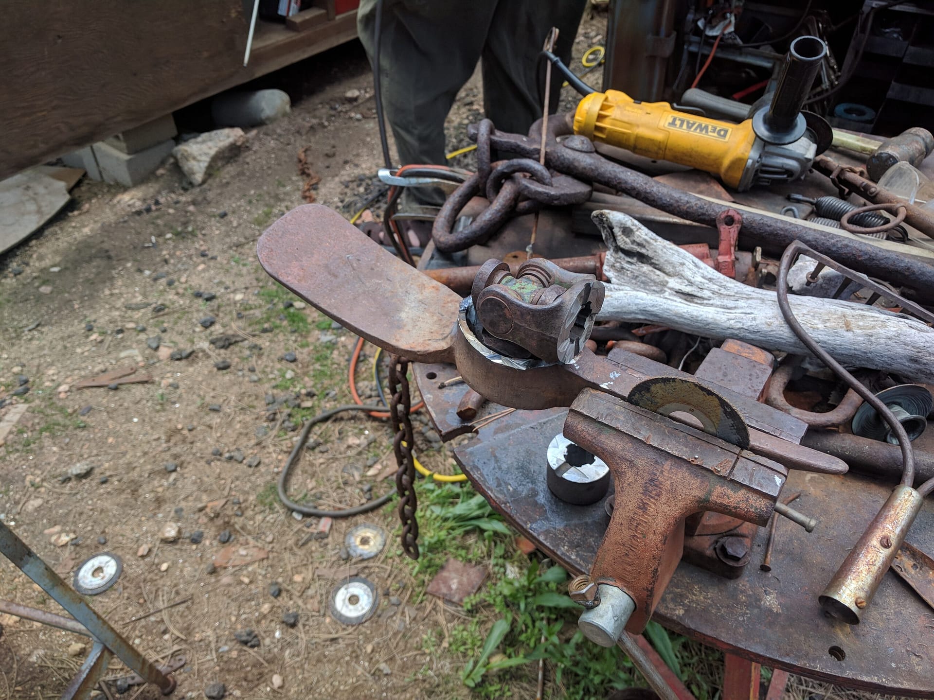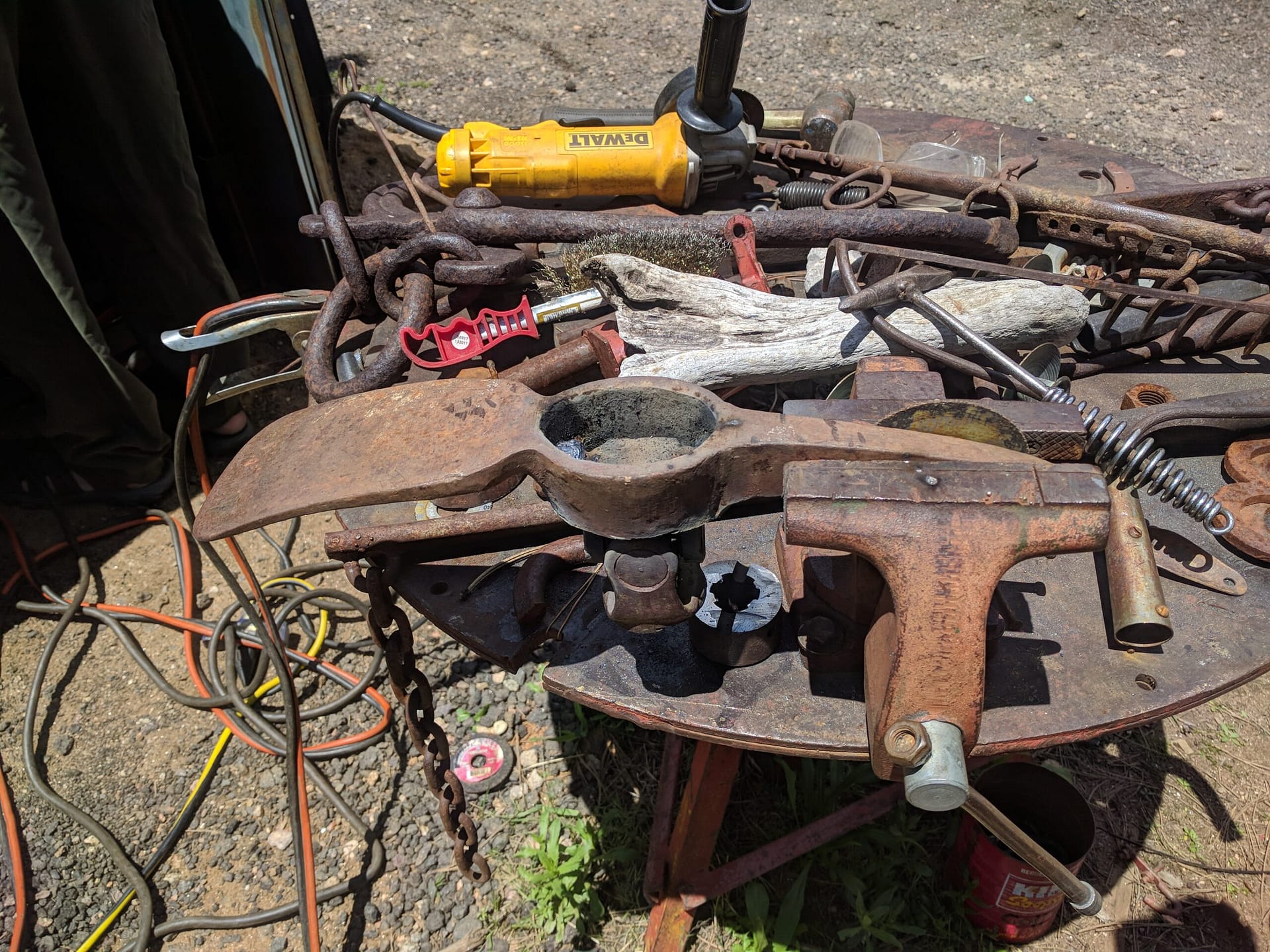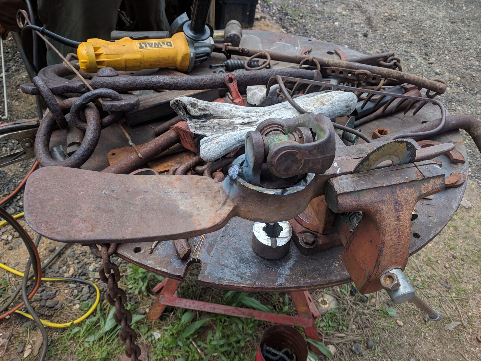 Miner’s pick mattock, a differential joint from a piece of old farm equipment, a mining rail, and two tractor seat springs.