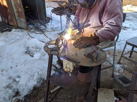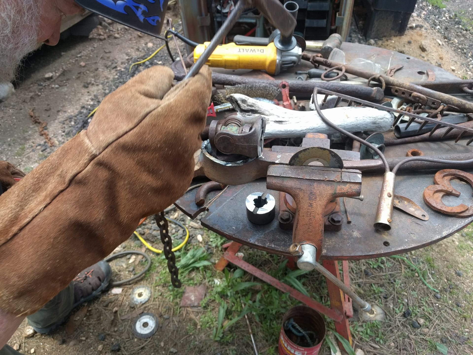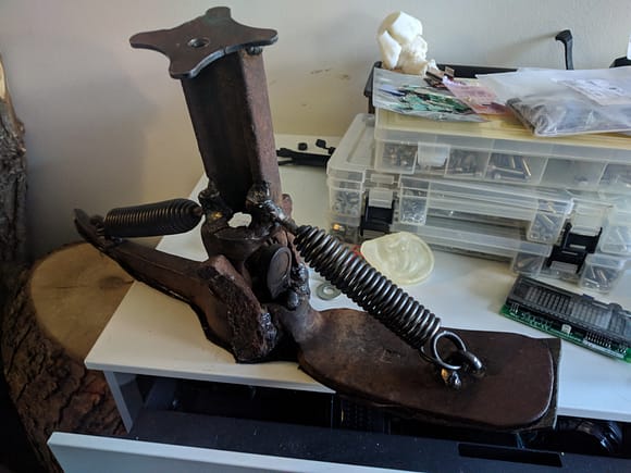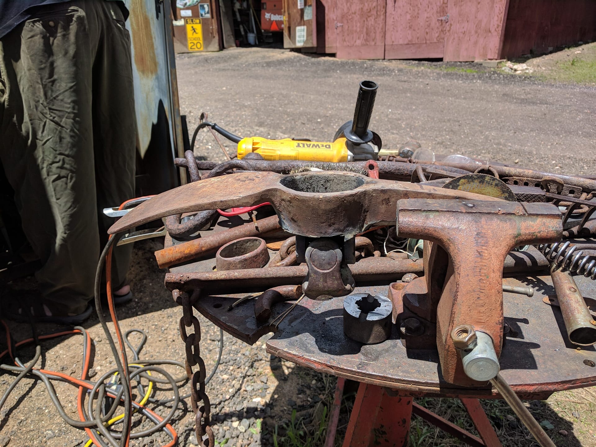 Miner’s pick mattock, a differential joint from a piece of old farm equipment, a mining rail, and two tractor seat springs.