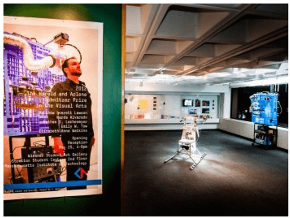 “This year’s $5000 first place Schnitzer Prize was awarded to Matthew Everett Lawson, a graduate student in the Art, Culture and Technology (ACT) program, for a wide-ranging body of work including such constructs as The Chair, a one-man helicopter made from found materials beneath the Stata Center; Glitch, a transcranial magnetic stimulator built from broken electronics, monitors and lab equipment; and Steel and Silk, a steel cage with suspended plexiglass plane, hammers, silk parachute cord, steel goggles, leather and rivets.”